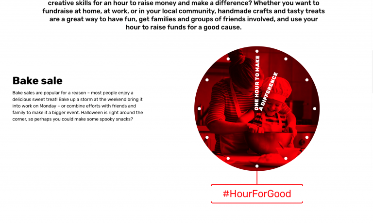 Our solution combined a simple yet motivating campaign name – HourForGood – with a powerfully distinctive clock face signature graphic, incorporating a typographical representation of that valuable extra hour. Across different executions, we used a variety of warm emotive imagery to convey both the “spending time together” and “fundraising ideas” messages.