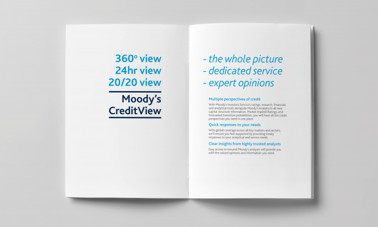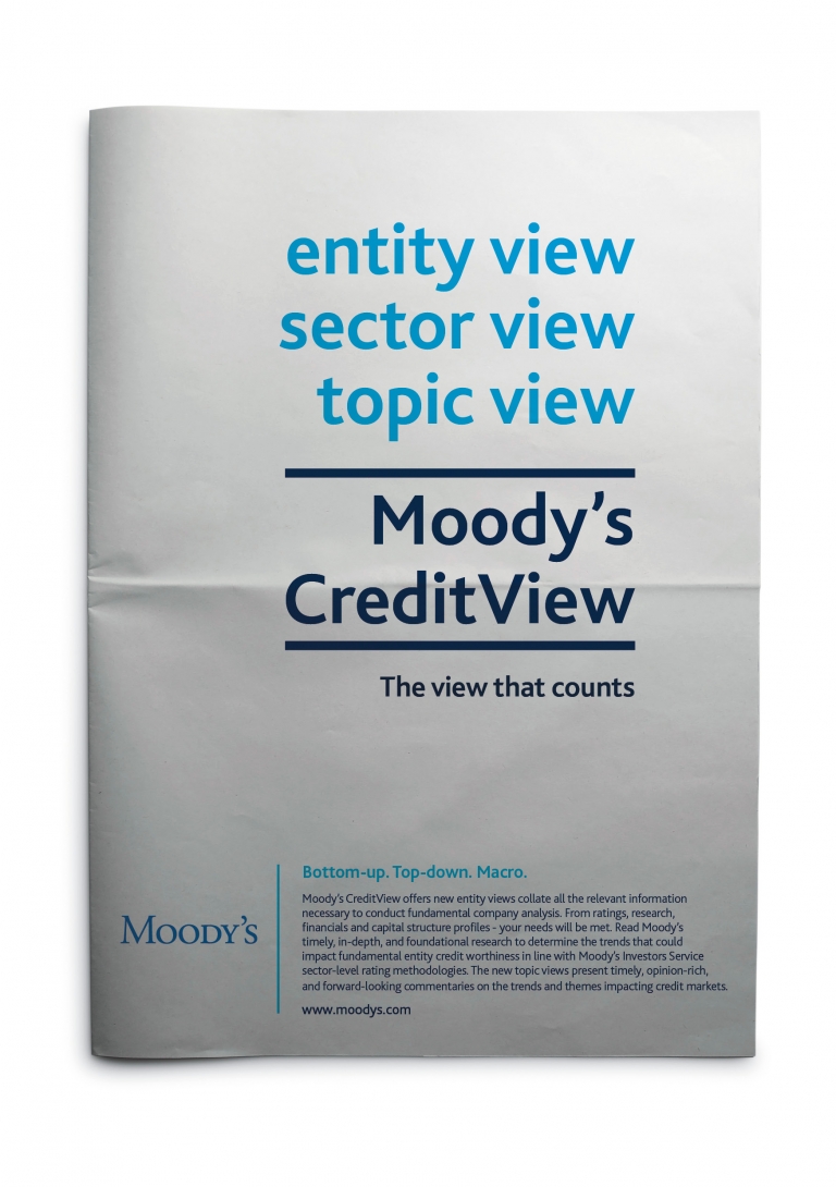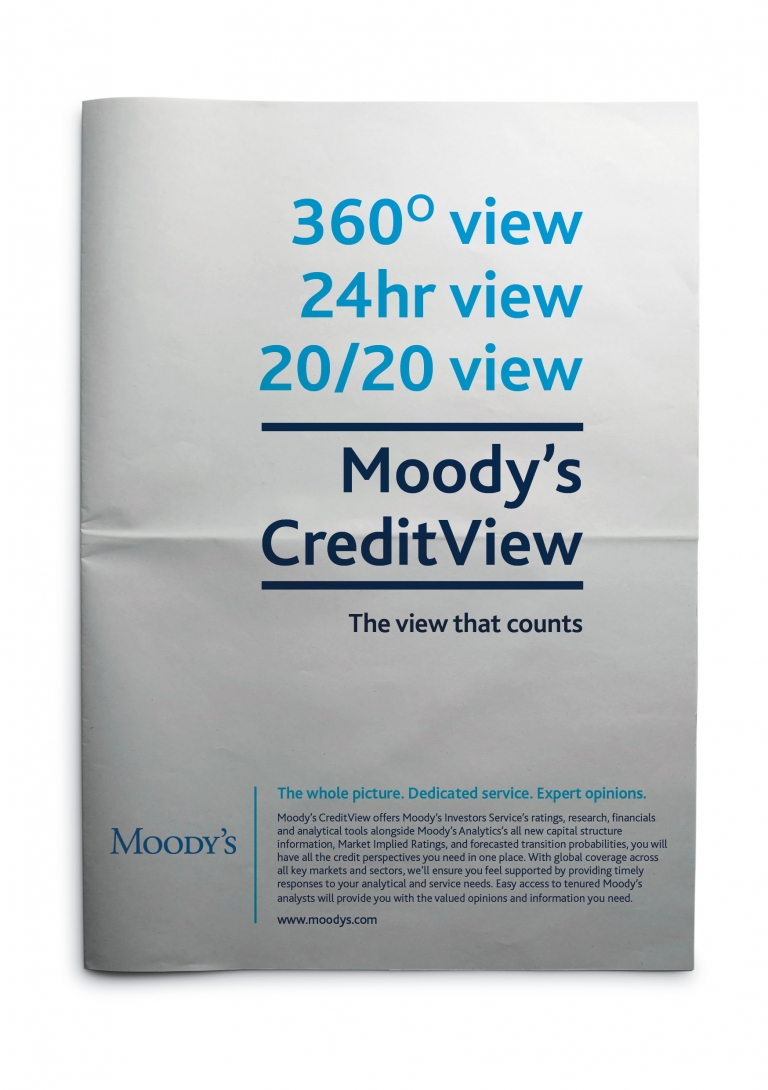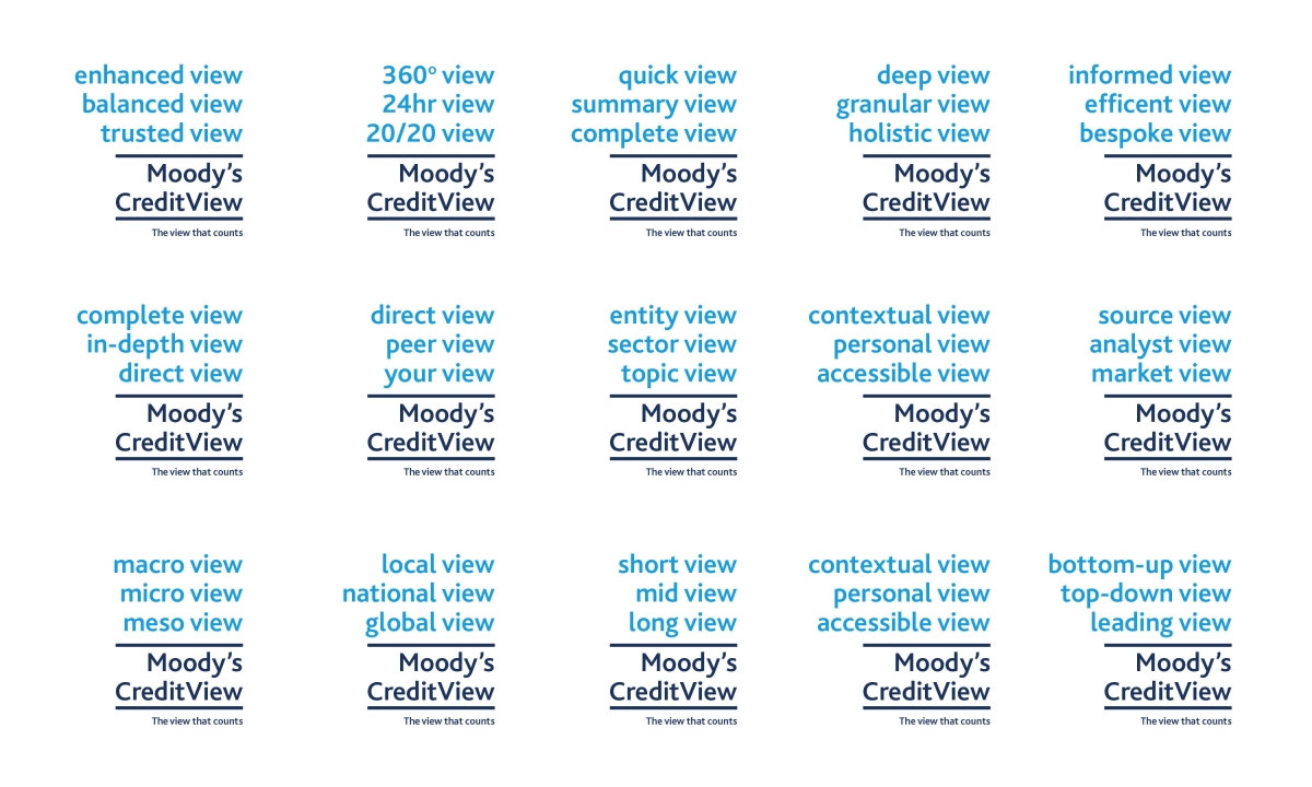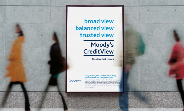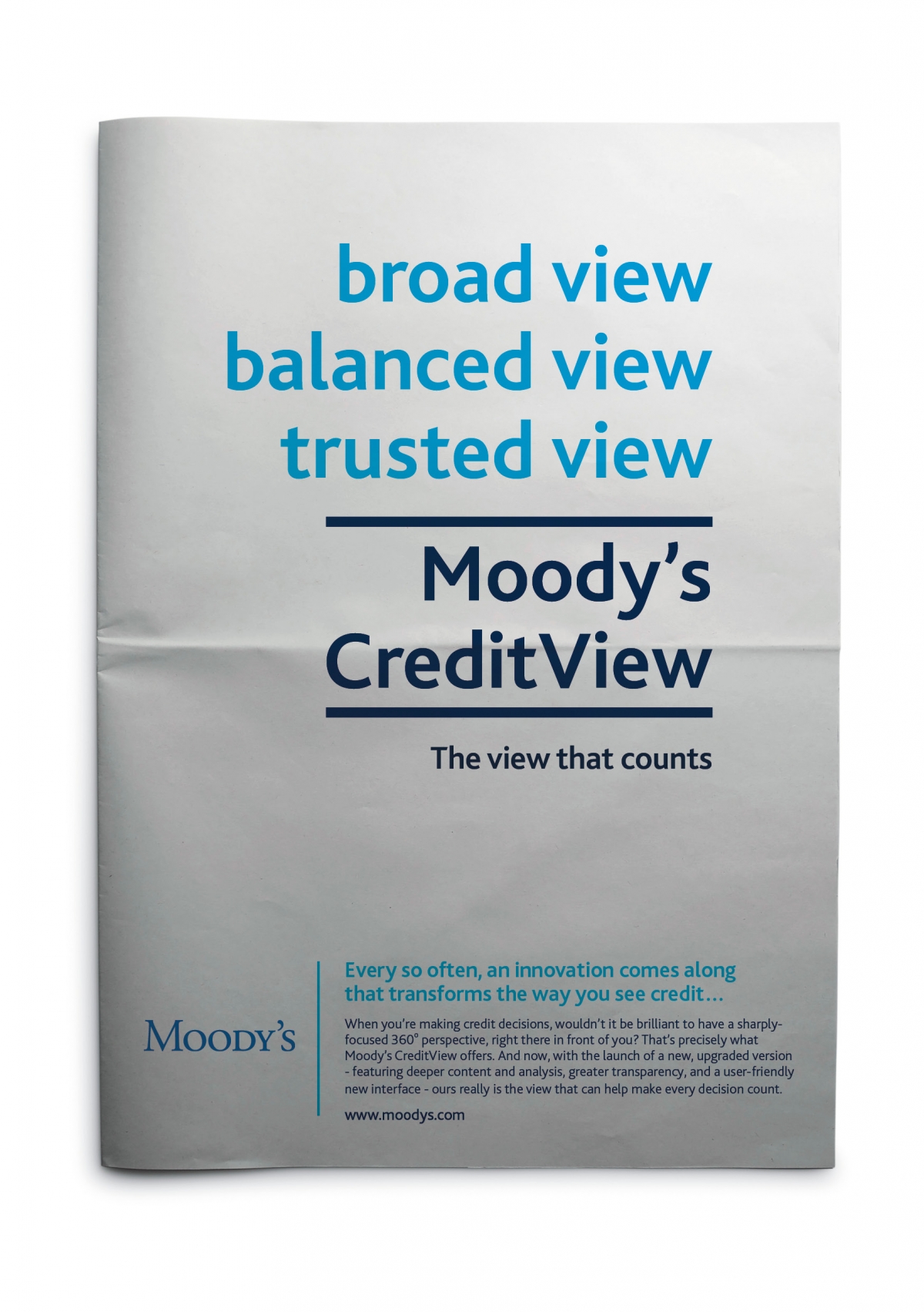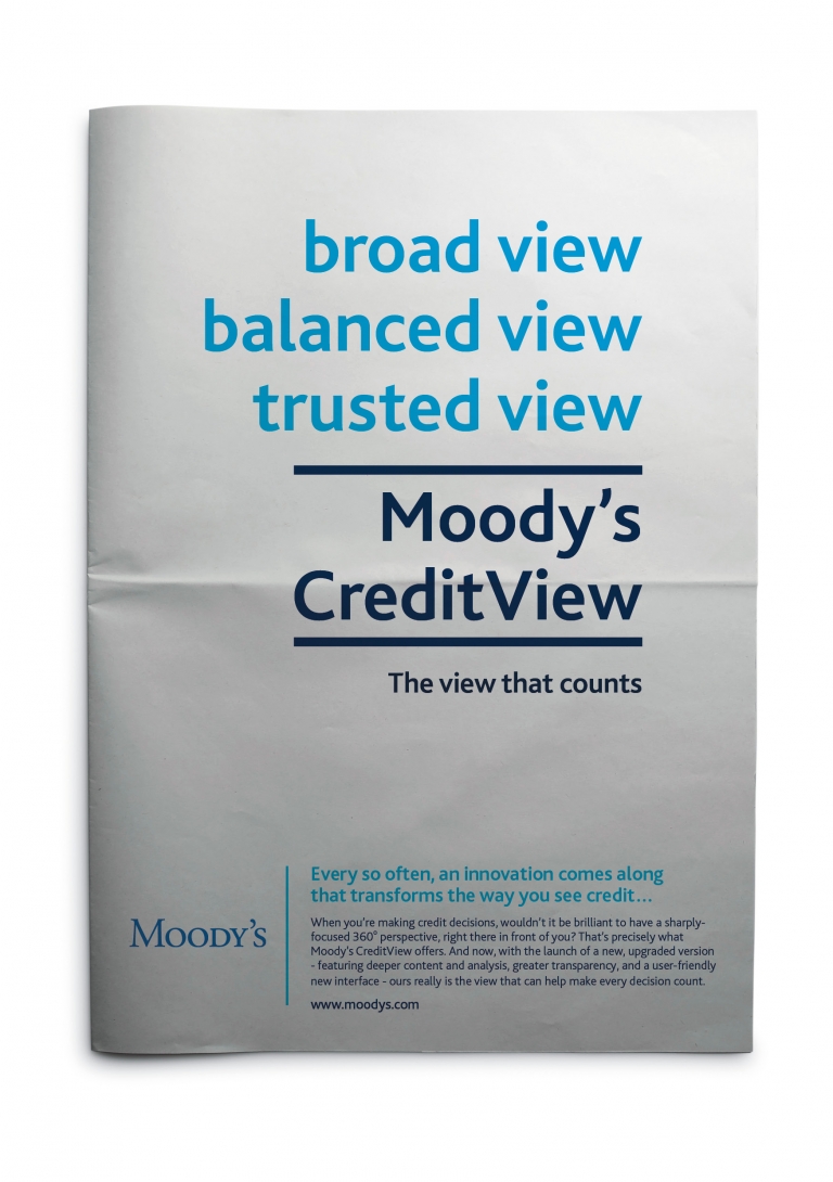 The answer, for once, lay in the product name – and, more specifically, the extraordinary number of ways that Moody’s now enable investors to view all the crucial data and analysis relating to any company, sector, region or country. Our quietly confident strapline almost wrote itself: The view that counts.