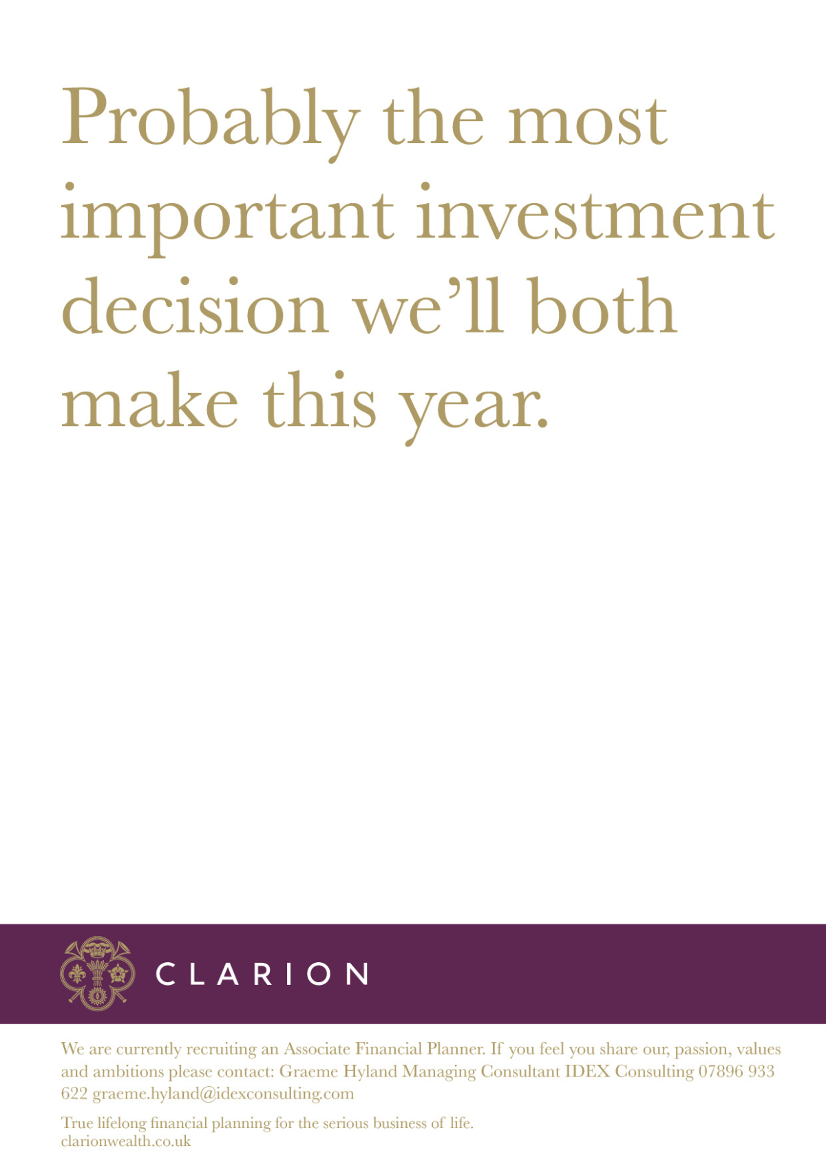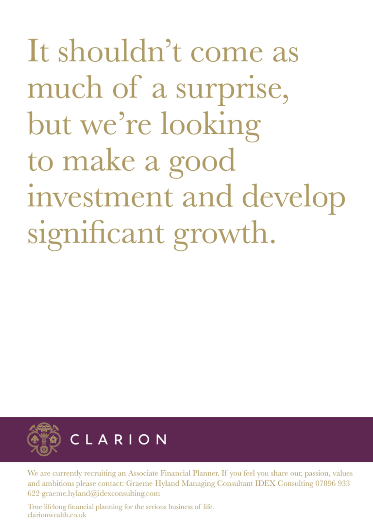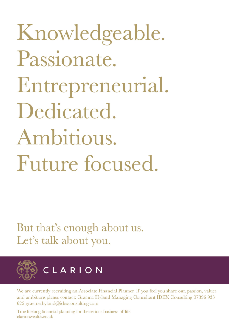 Following on from our highly successful rebrand of Clarion Wealth Management, we were invited to create a recruitment advertising campaign that would attract top financial talent and reflect the firm’s premium positioning.