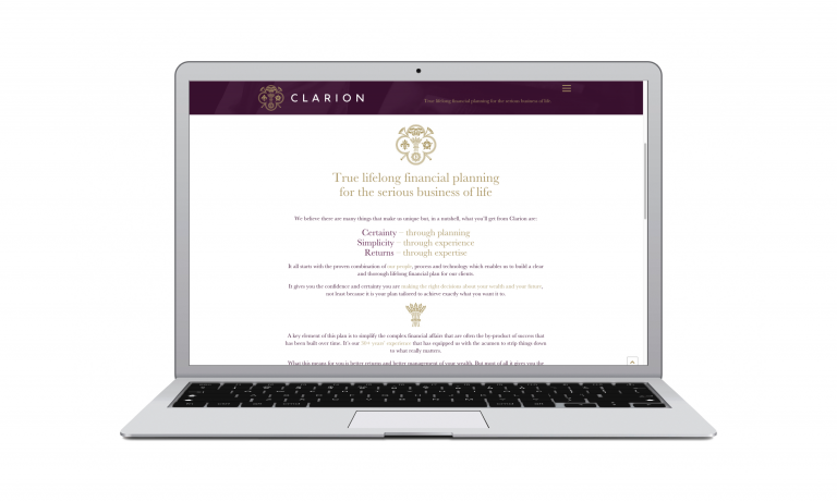 [collapse_panel panel_id="my_panel"]When they came to us on a recommendation, they were looking for a rebrand that would connect on an emotive level, as well as a rational one, with this demanding target audience, and strongly convey the bespoke, boutique nature of their offering.Our starting-point was creating a powerful brand proposition, putting the focus on Clarion’s role in helping clients enjoy the fruits of their success, through “true lifelong financial planning for the serious business of life”.