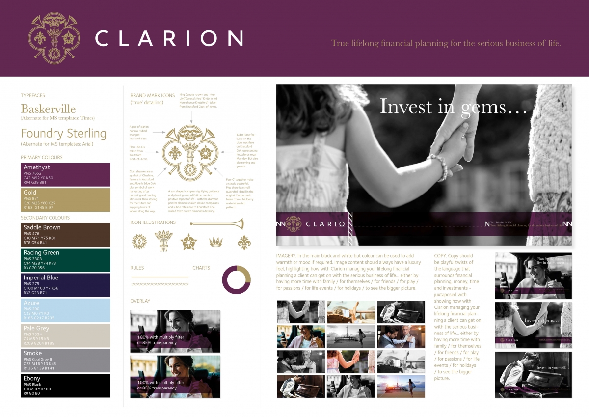 Juxtaposed with this heritage-focused mark, the logotype is strikingly clean and contemporary. And the richness of the key colours we chose – amethyst and gold – further strengthens the satisfying sense of a long established brand completely at home in the modern world. In terms of visual language, we went for highly emotive black-and-white photography, bringing alive the brand promise of helping clients to enjoy what matters most in their lives. Finally, in headlines and copy, we set out to find playful ways to put Clarion’s own spin on the conventional language of financial planning, inviting clients, for example, to “plan to have no plan” or to “invest in yourself”. . . in order to get the most from “the serious business of life”.