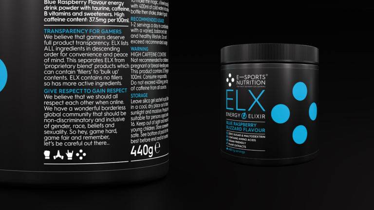 Overall, the visual style we created played a vital role in positioning ESN and its energy drinks and in-game food meal replacement shakes as something genuinely new and different; premium, performance-focused, designed by and for gamers – and, crucially, as a “force for good” in the gaming community.