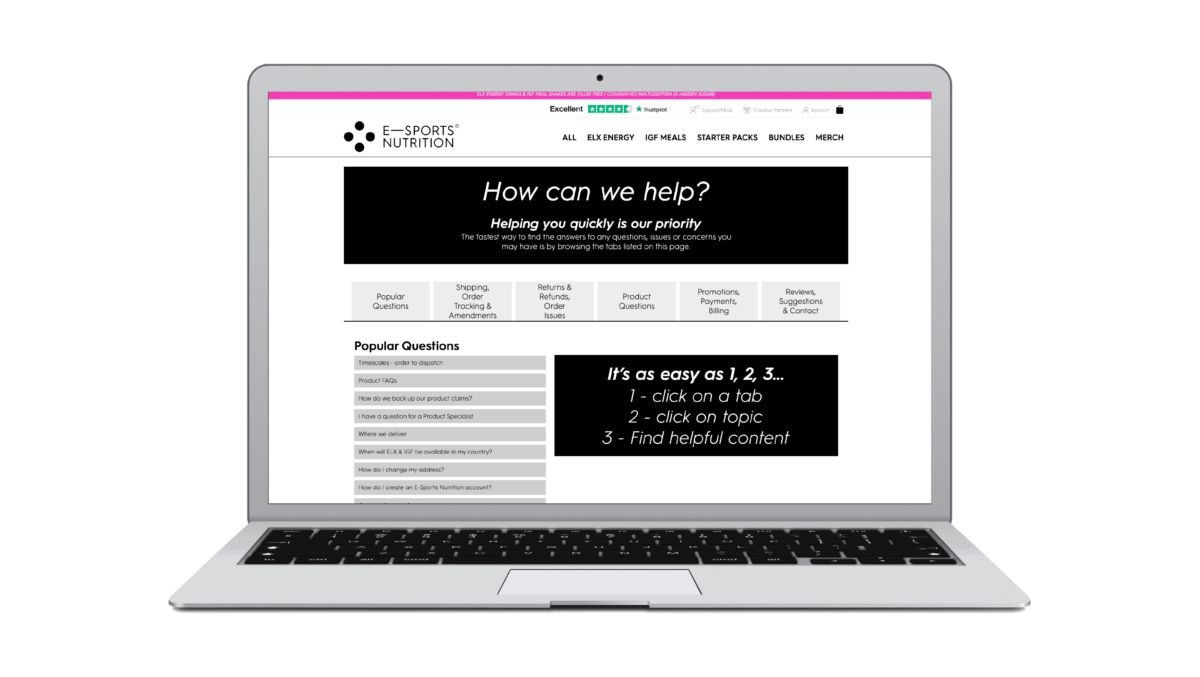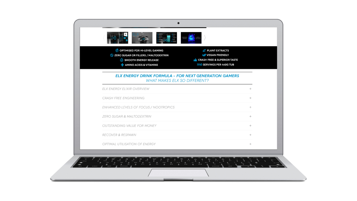 [collapse_panel panel_id="my_panel"]Looking at the competition, we saw a sea of samey imagery and visual clichés. We knew our site needed not just to look and feel different, but to reflect the brand ethos of showing respect for gamers, through accessibility, clarity and transparency. Key parts of the ESN brief was for the website provide detailed information about product formulation and to being there for them post-sale if there were any issues or further questions.