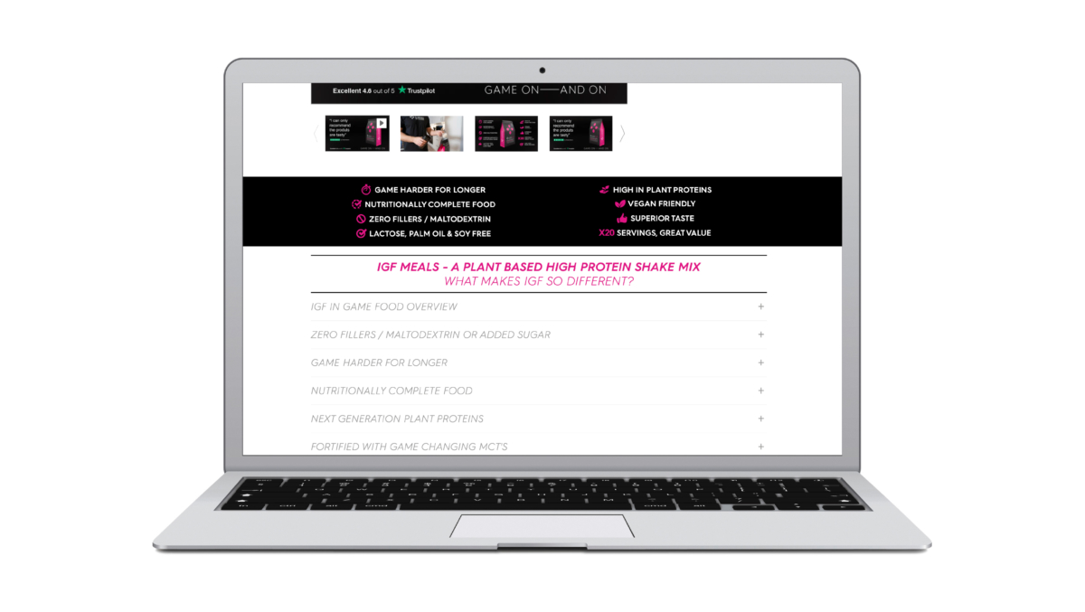 And, while we are guiding you round the site, here is a typical product landing page which helps with SEO, while providing overviews of the two main ESN product ranges, ELX energy drink formulas and IGF In Game Food meal replacement shakes.To finish the tour, here’s an individual product page, designed not only to sell that particular flavour, but also to upsell the customer another complementary flavour. And, just by scrolling down from at-a-glance sales pitch, customers can access in-depth information in accordions on ingredients, nutritional values, directions for use, and more – allowing ESN to showcase their considerable nutritional expertise and deliver on the belief in transparency and high product standards – go read they are amazingly in-depth and informative!
