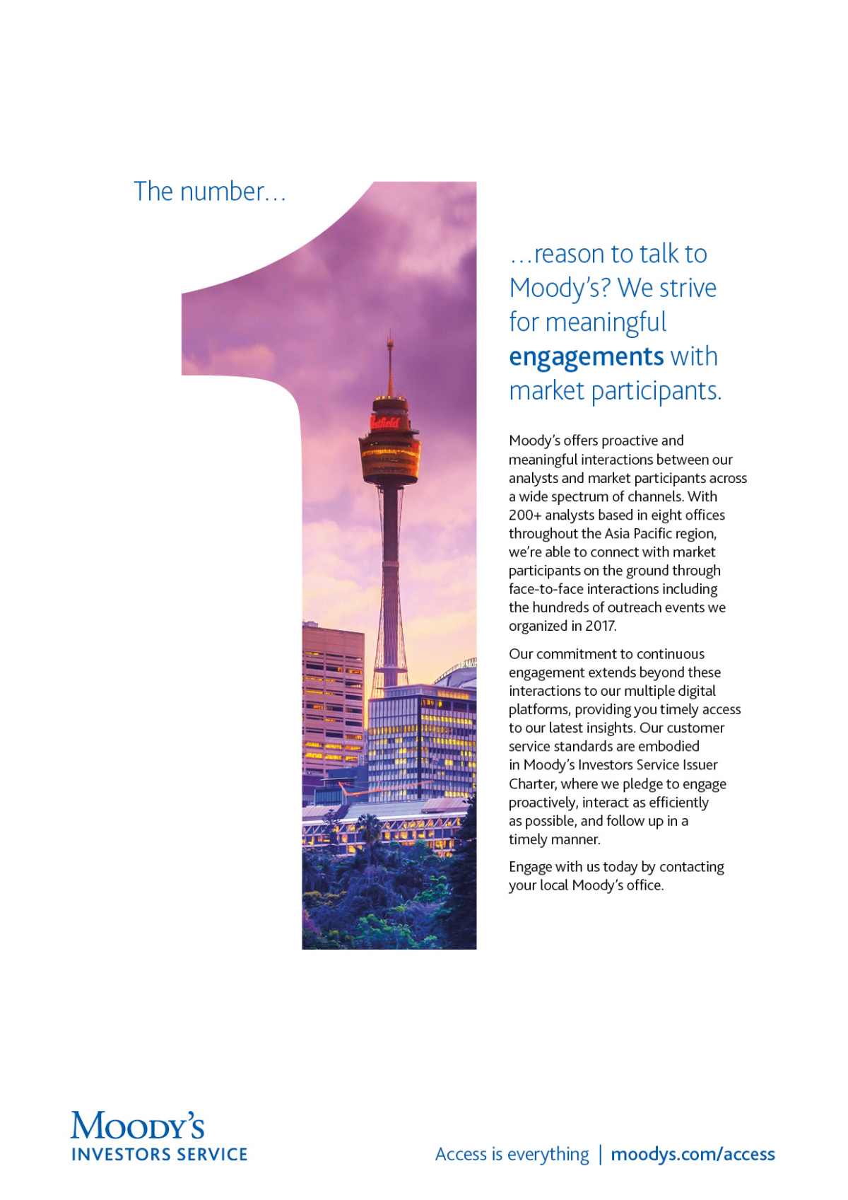 Our elegant solution was a bold “No.1” window graphic, used as a visual metaphor for Moody’s leading view of regional markets. Each execution spotlighted a key differentiator — from trusted insight to world-class expertise — delivering a campaign that was confident, cohesive and distinctly Moody’s.
