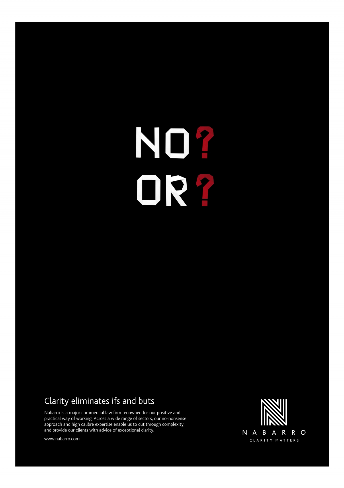 The concept was originally devised to appear on display screens in the firm’s new offices. But it quickly became clear that fine legal minds were enjoying the challenge of decoding our hidden messages. At which point, the argument for running the Nabarro Clarity Matters Typographic Conundrums as an ad campaign in the trade press became – well, an open and shut case.