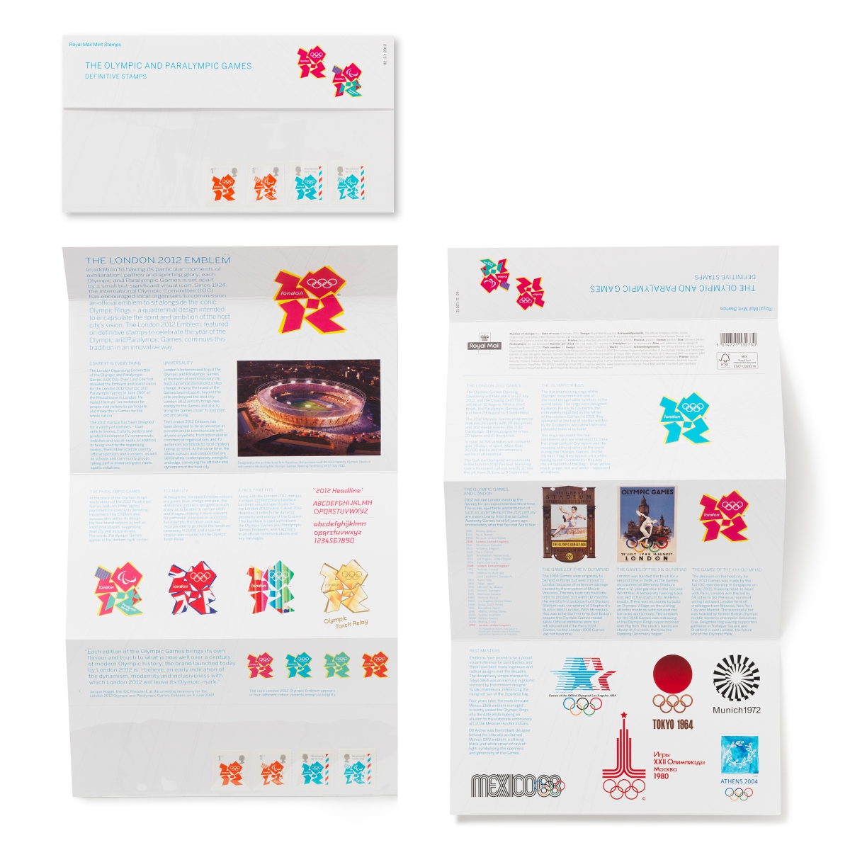Researched and designed by Neon, the Royal Mail 2012 London Olympic Definitive Stamps pack tells the design story behind the 2012 London Olympic emblem, which was to appear on a set of Royal Mail definitive stamps during the Games.Read More…