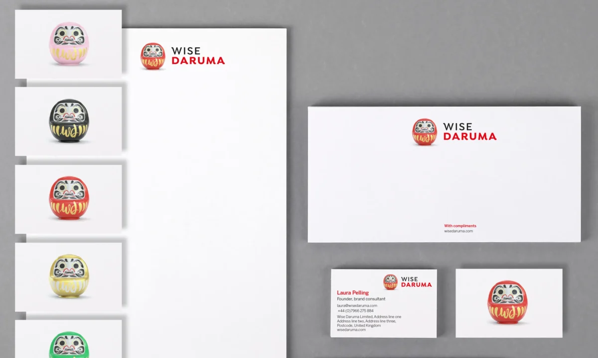 To complete the identity, we also created the brand line “The wise listen, plan, and act with purpose.” — a phrase that grew from our understanding of Laura’s consultancy approach and the traditional symbolism of the Daruma itself. It speaks to her strategic process of listening deeply, thinking deliberately, and acting decisively — while anchoring the brand in wisdom, clarity, and intent.